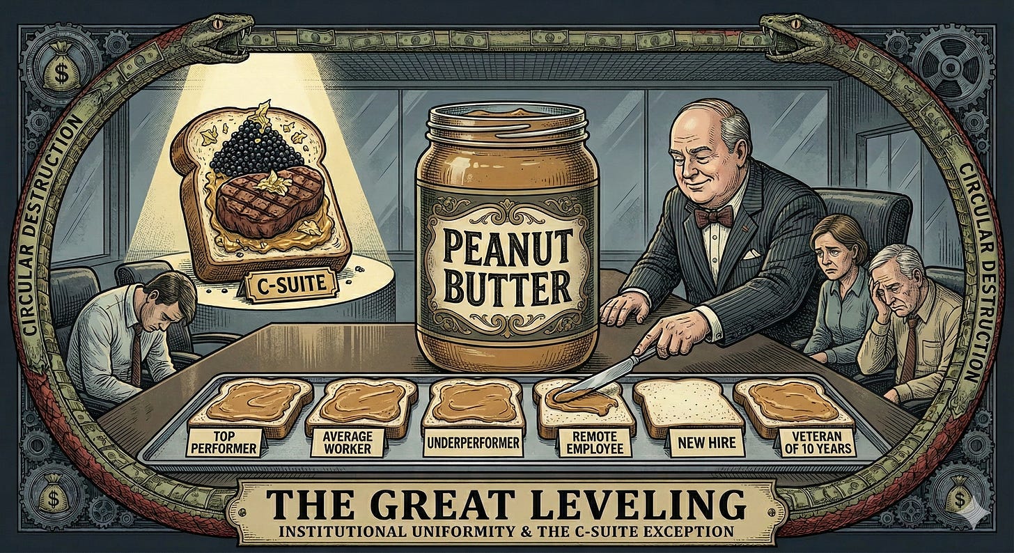 There is a reason it is called the peanut butter raise and not the mediocrity subsidy, even though both descriptions are accurate. Language in corporate environments is never accidental. The cheerful domestic metaphor performs the same function as the language of rightsizing and workforce optimization and strategic restructuring — it makes a deliberate organizational choice sound like a natural, even pleasant, inevitability.