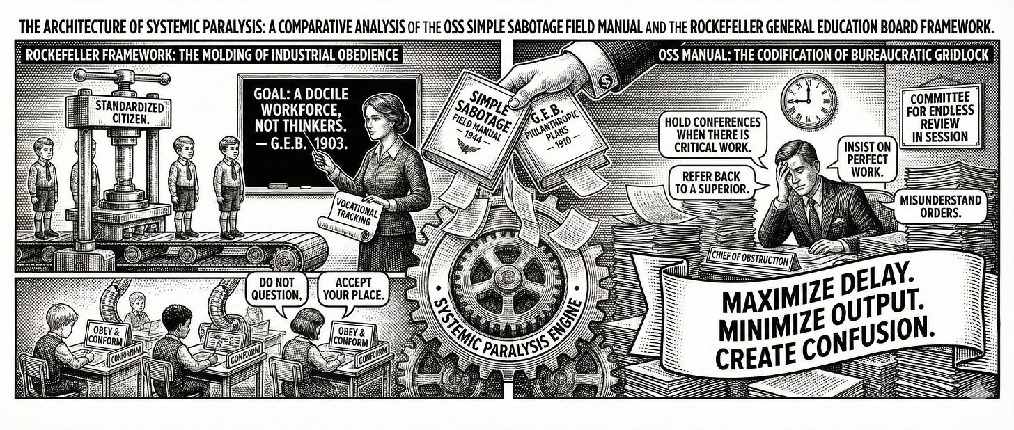 The modern American workplace is currently experiencing a profound crisis of engagement and productivity, characterized by phenomena widely labeled as “quiet quitting,” “innovation stagnation,” and “bureaucratic paralysis.” While contemporary analysis often attributes these pathologies to recent shifts in generational attitudes or technological disruptions, a rigorous historical and structural analysis suggests a much deeper, more systemic origin. This report posits that the fundamental dysfunctions of the modern corporate environment are the direct, albeit unintended, consequences of a century-long educational experiment initiated by the General Education Board (GEB) in the early 20th century. By juxtaposing the foundational documents of this educational framework—specifically the writings of Frederick T. Gates and the principles of scientific management—with the tactical doctrines of the Office of Strategic Services (OSS) Simple Sabotage Field Manual of 1944, a disturbing isomorphism emerges. The behaviors codified by the OSS as effective methods for dismantling enemy productivity from within are structurally identical to the behaviors conditioned in students through the “hidden curriculum” of the factory-model school system.