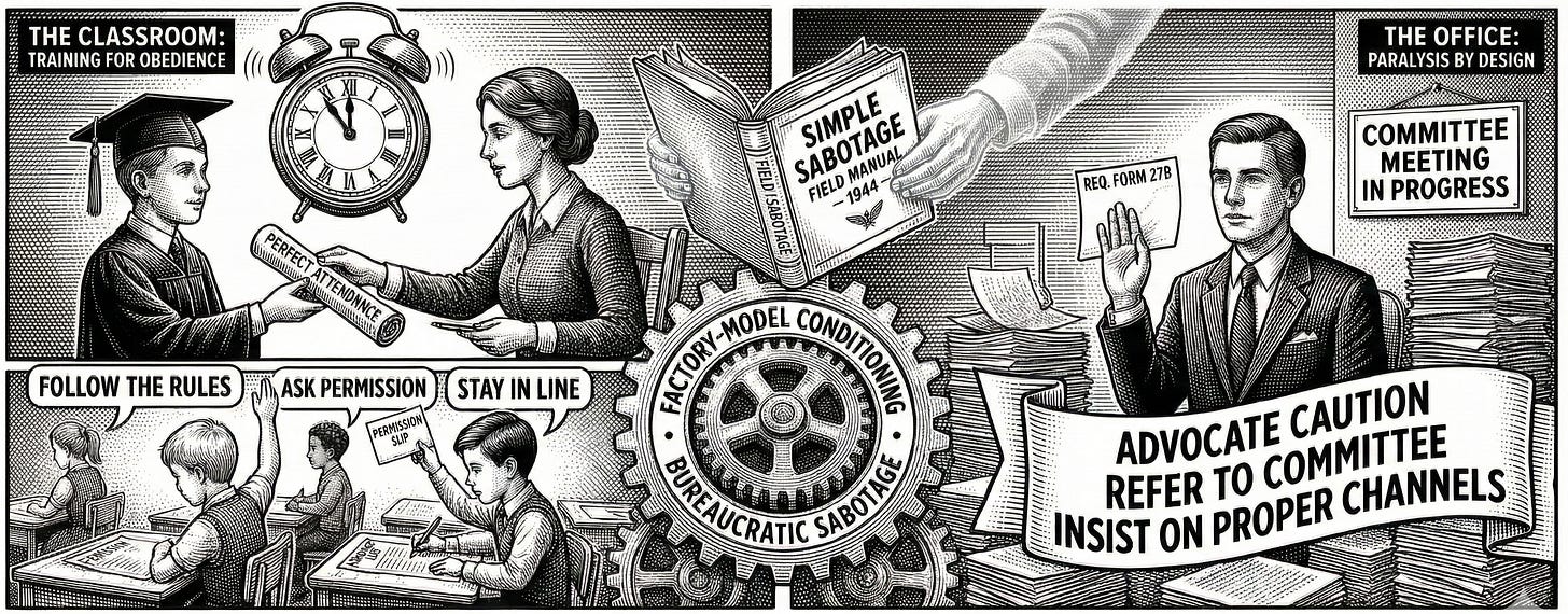 Why does your company move so slowly? Why do meetings multiply like rabbits? Why does every decision require three approvals and a committee? The answer isn’t malice. It’s your education.