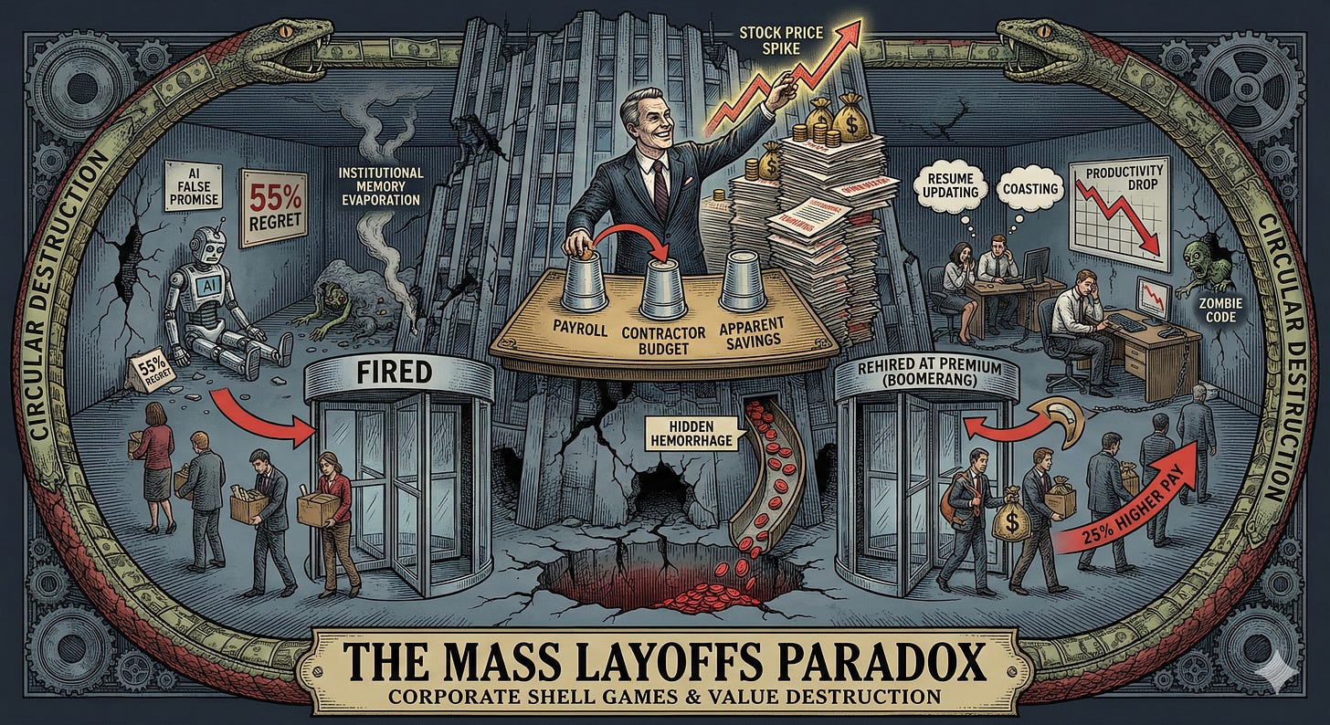 The layoff-rehire paradox reveals a fundamental truth about modern corporate governance: the performance of efficiency has become more important than actual efficiency. The ritual satisfies demands of quarterly capitalism while destroying long-term productive capacity. Here’s what you need to understand: